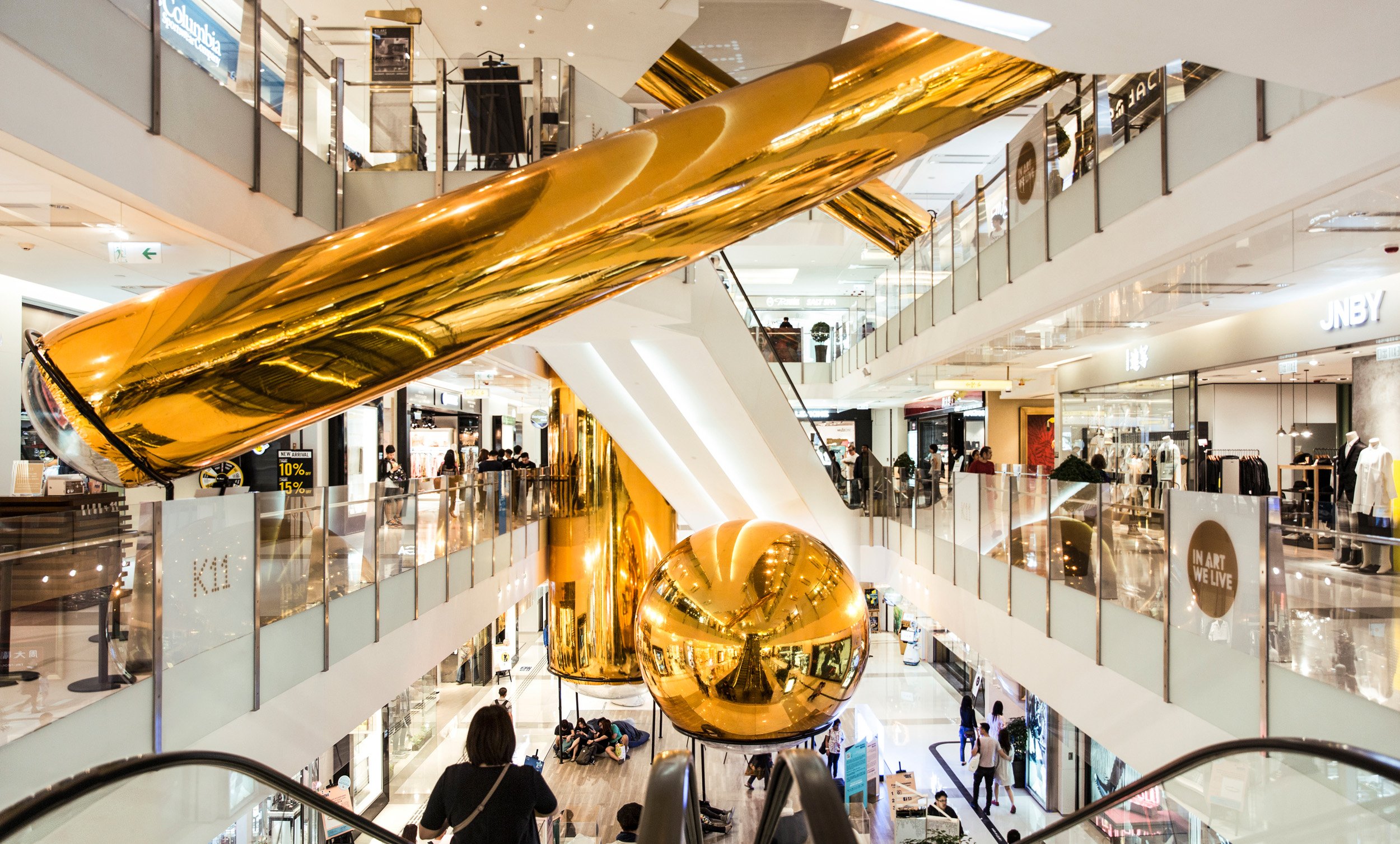 Designed specifically for K11, Golden Bubbles reflect and exaggerate the movement of people above, below and around. These large golden inflatables span the atrium, weaving between multiple levels and escalators. The objects act as curved mirrors distorting reality by warping the surroundings into one field of view.