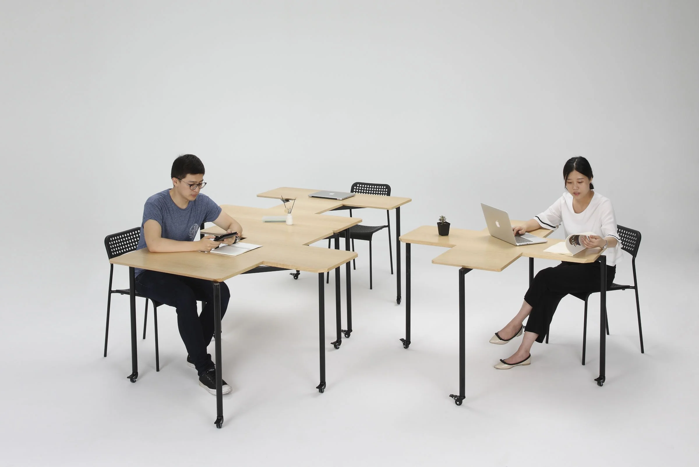 Table surfaces are shaped with perpendicular notches and protrusions that are designed to lock together with a simple friction fit connection. An assembled Tetris Table can therefore be lifted on either end without coming apart. Additionally, the tables can be stacked for storage while lockable castors allow for maximum flexibility.
